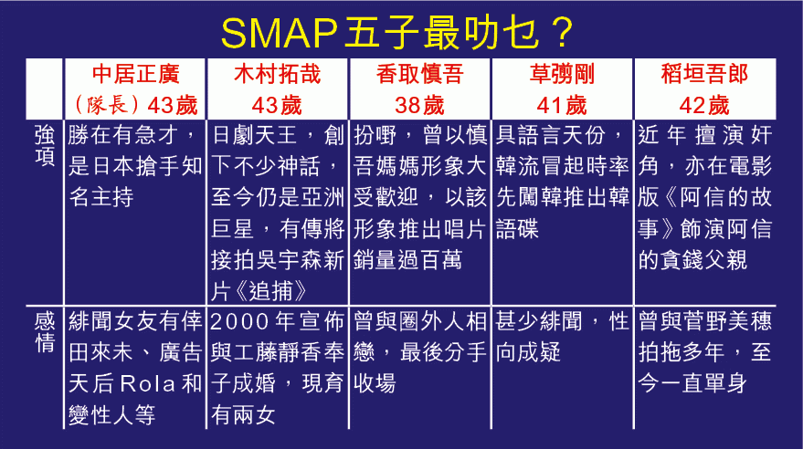 日本國民級男子組合SMAP昨日凌晨忽然驚爆解散消息,令這隊組成28年的著名組合將成歷史。據知曾捧紅不少男星的尊尼事務所,近年因內部派系鬥爭越趨激烈,導致SMAP成為今次內訌的犧牲品,隊長中居正廣拉隊與香取慎吾、草彅剛和稻垣吾郎隨直屬經理人離巢另起爐灶,隊中唯一有家庭負擔的木村拓哉則會留低,料SMAP最快會在今年9月正式散band。