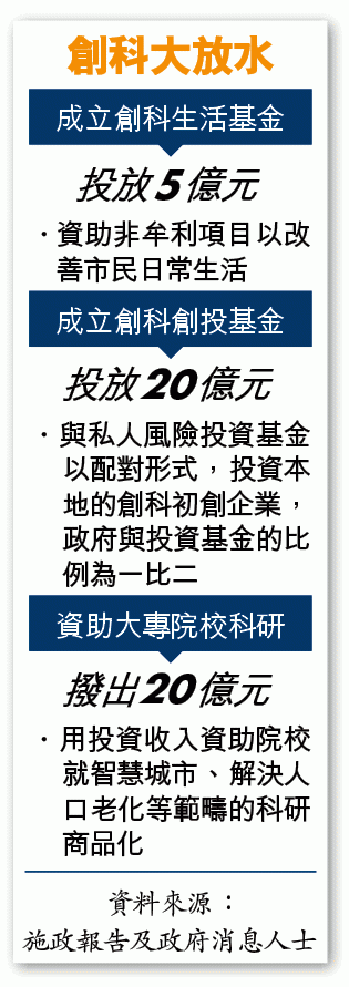 至於投放5億元的創科生活基金,政府消息人士解釋,該項基金的資助對象其實是非牟利項目,故社福機構、公共服務機構是目標申請者,而申請者需提供具體計劃並已經將項目產品化,同時希望項目能持續使用,由於該基金只有5億元,故每宗申請估計可能只獲批數百萬元。