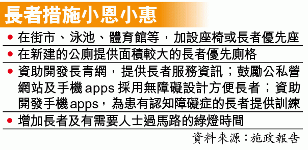 【本報訊】長者哀求全民退休保障,政府表明有保留,但各項「雞毛鴨蒜」政策卻一錘定音。特首梁振英昨發表任內第4份施政報告,把增設戶外座椅、長者優先廁格、增加長者過馬路時間等政策納入報告。長者斥梁施以小恩小惠迴避全民退保,大呻搵笨;立法會議員也批評梁已「冇貨交」,堂堂一份施政報告淪為建制派區議員的工作報告。