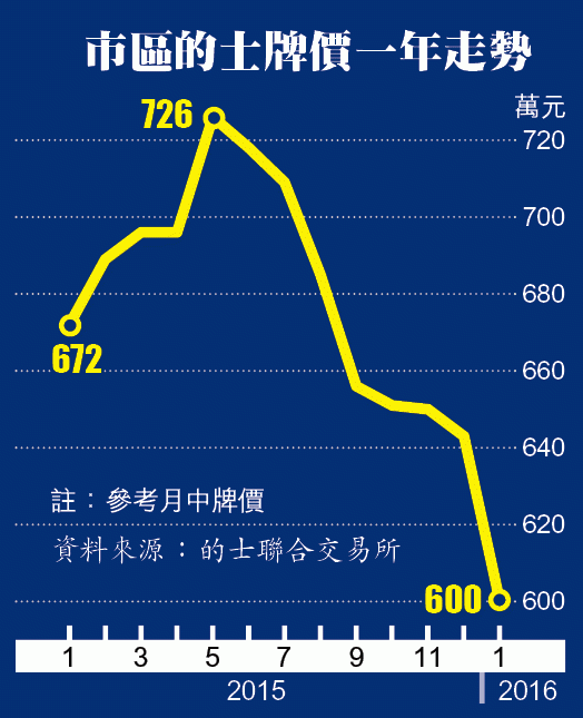 不過,恒生指數自去年6月底起,跟隨中國股市暴跌,的士牌價亦隨即回落,近日跌幅更進一步擴大。以最新成交價600萬元計算,如果炒家去年底入市,持貨一個月已「損手」逾40萬元。
