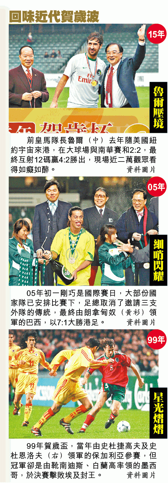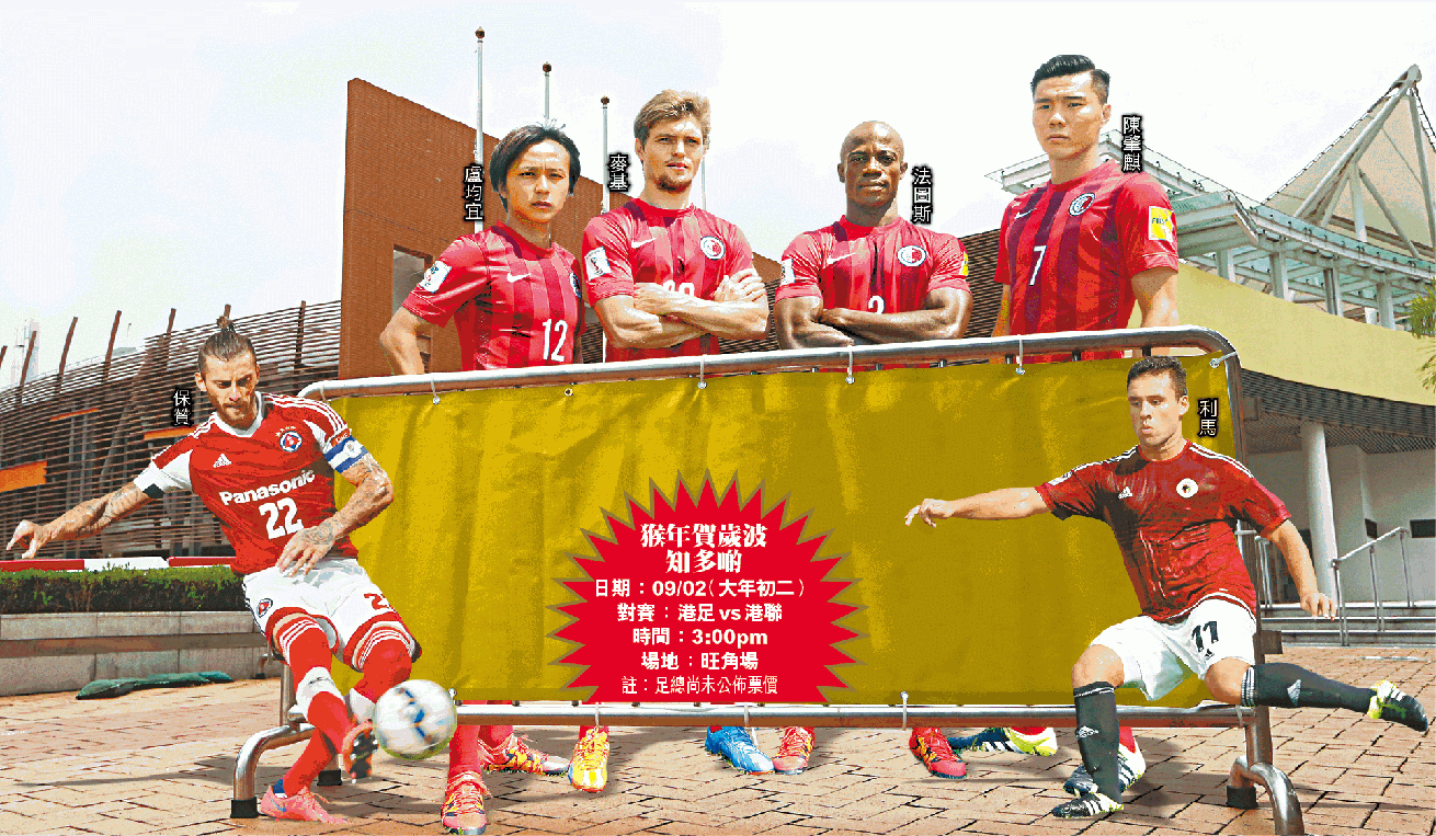 【猴年賀歲足球賽】鑑於香港飛馬未能物色外隊,令有多年歷史的賀歲波幾乎「流產」,足總臨時拉伕下決定,由港足與港聯上演猴年賀歲波,但時、地卻由年初一大球場變成初二旺角場;對於今次沒外隊的賀歲盃,球迷有讚有彈,然而,港足隊長陳偉豪認為有新鮮感,相信有一定吸引力。