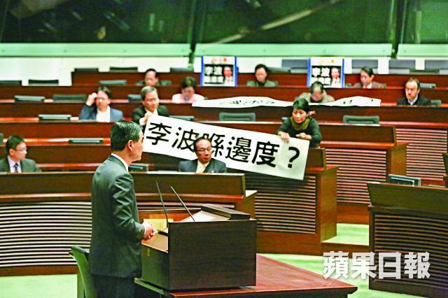 梁振英昨到立法會出席答問大會前,多名泛民主派議員已一字排開,在會議廳外拿着「李波喺邊度,一國兩制喺邊度」標語等候。梁及多名問責官員行入會議廳時,見到標語都默不作聲,政務司司長林鄭月娥更從側門進入會議廳避開。