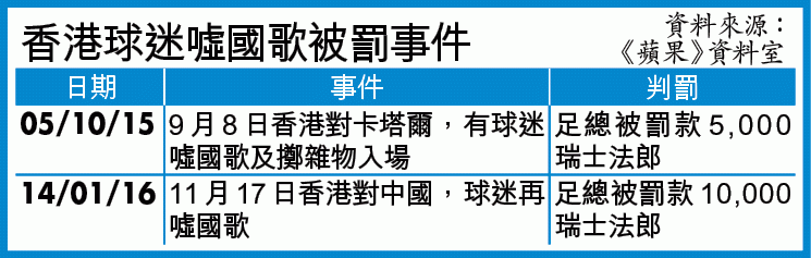香港足總表示收到國際足協通知,指去年11月的港中戰中,香港球迷噓國歌是不當行為,而足總需要為球迷的行為負責,故裁定足總違反了《國際足協紀律章程第67條1及3節》,判罰一萬瑞士法郎;國際足協還警告,若果再犯,會加重處罰。足總主席梁孔德籲球迷克制,「請球迷不要再噓,若果再被國際足協罰的話,就會影響我們的財政,可能會導致一些計劃擱置,希望球迷自律」。