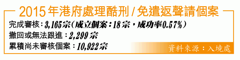 入境處資料顯示,去年共3,165宗免遣返聲請個案完成審核,當中僅18宗成立,成功率僅0.57%;尚未處理的累積個案達10,922宗。成功個案將轉介聯合國難民事務高級專員署並安排他移居至第三國家。處方續指,去年有1,152申請人被捕,當中920宗涉及盜竊等嚴重罪行,232人涉從事黑工。