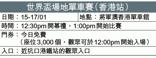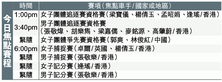 說回今日的比賽,香港多名男、女車手都會上場(見附表),焦點是賽前以「紙包唔住火」形容力爭男子捕捉賽及記分賽雙金心情的張敬樂。昨戴着寫有「HONG KONG」帽子的他十分醒神:「我想將這團火先撳住,用獎牌去包,很期待明日(今)的比賽,目標都是爭金。」阿樂曾於2014年贏得世界盃捕捉賽銀牌及世錦賽銅牌,去年10月則奪世界盃記分賽金牌。
