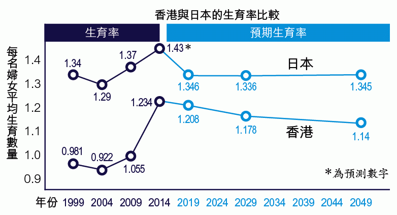 人口老化的主要原因是婦女生育率過低。從附圖,大家可以看到由1999至2014年,香港婦女生育率大約是1.1個孩子,低於現時正面對人口萎縮的日本的1.36個孩子。以現時香港婦女的低生育率來說,這絕對不足以支持香港人口長期持續增長。此外,在過去幾年,內地人以單程證來港的數字明顯減少。在這兩個負面因素的影響下,香港出現急速老齡化社會看來不能避免了。