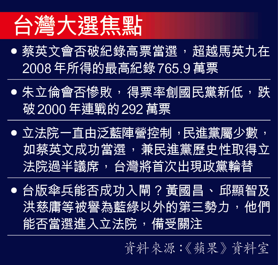 馬英九在上屆總統選舉中拿到689萬票,而2008年他更獲創台灣歷史的765.9萬票。此次蔡英文爭取突破該紀錄的同時,朱立倫得票率可能創國民黨新低,跌破2000年連戰的292萬票。
