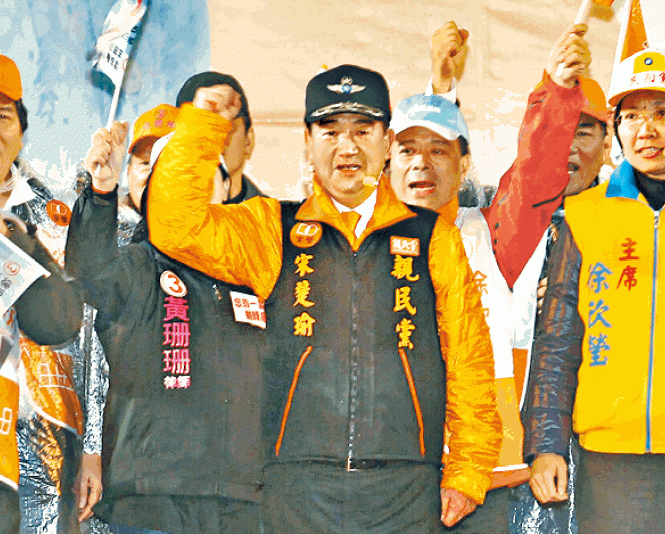 親民黨總統候選人宋楚瑜雖勢為陪跑,昨仍堅持掃街,籲勿向藍綠妥協,擺脫一黨獨大。他在台北田徑場舉辦誓師晚會,吸引過萬名新民黨及國民黨支持者,集氣「宋進總統府」。