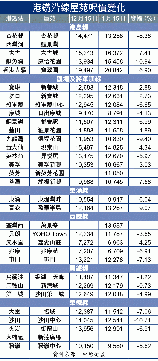 中原地產研究部高級聯席董事黃良昇指出,本周指數反映美國加息後一周樓價繼續向下調整,當中只有新界西輕微回升,顯示樓價下跌後吸引市民上車,在剛性需求下樓價並非一面倒向下,但加息後數周是關鍵,預計調整尚未結束,CCL跌破136點後,將會下試120點。