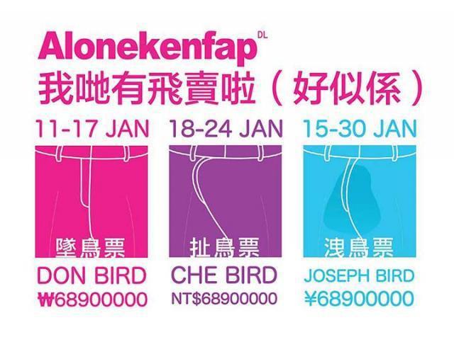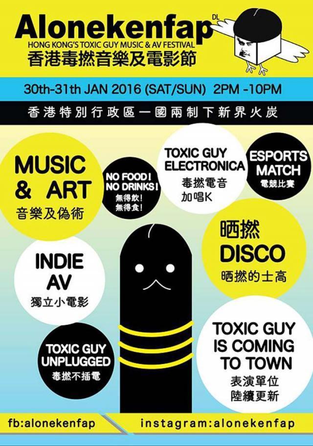 Alonekenfap那隻鳥,讓我笑鳥。鳥的樣子明明就是雷神……講笑,是徐錦江。「它叫錦X樣。」我大笑鳥。負責飾演「錦X樣」的X徐生(化名)說:「我哋覺得Clockenflap好離地,想用本土啲,貼地啲嘅方法惡搞,徐大俠係港產三級片標誌。」「錦X樣」原來係咁樣,明白了。喜歡電子音樂的邱生說:「我當然有去Clockenflap,之前去完就諗無去的人,心目中會否都有個音樂藝術節?」如果真有這樣的活動,讓大眾標籤的所謂「毒L」狂歡,到底有乜玩?然後就有了今次的Alonekenfap。一連兩天的音樂藝術節在他們的火炭工作室舉行,有懷舊打機比賽,還有多多鹹多多趣的改詞流行曲卡拉OK。邱生補充:「我們還會玩聲畫配合,例如畫面播愛情動作片,配離地中產Clockenflap必定喜歡的電子音樂:又或者播王家衞的電影,配初音的歌曲。」孔生(化名)與徐生也會有unplugged表演,同場加映獨立短片,玩嘢同時也有五分認真。