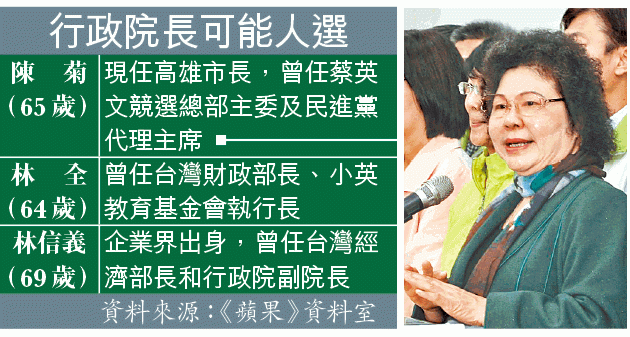 【本報訊】台灣大選過後,候任總統蔡英文如何籌組新內閣成各界焦點話題,但她至今仍未就如何組閣作正面回應。而蔡英文全國競選總部主委、高雄市長陳菊近日盛傳將出任行政院長,陳昨對此只回應「假設性問題不回答」。另一方面,現任行政院長毛治國前日請辭,有行政院高層昨指將於今午提出內閣總辭,為早前總統馬英九提出、充滿憲政爭議的立法院多數黨組閣鋪路。