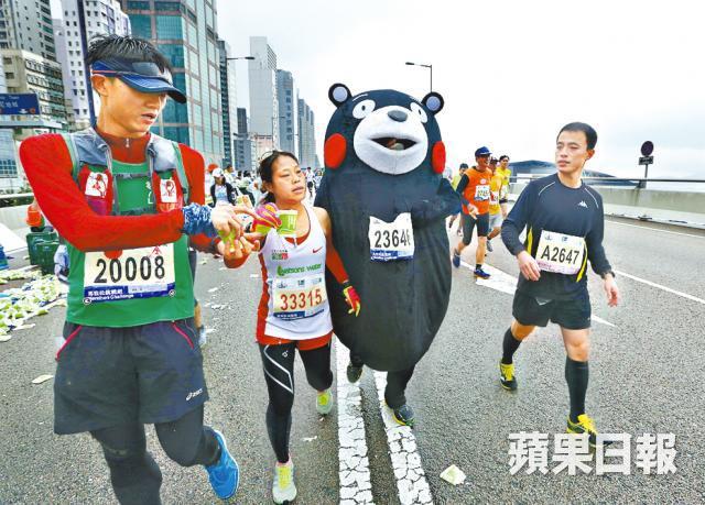 正牌的熊本熊今年則第2年現身賽場,就算要狼狽地以黑膠袋包裹雙腳,亦緊守中途補給站及終點打氣,並為選手帶來熊本縣特產番茄,即時補充因長跑而燃燒的脂肪及蛋白質。難得可以野生捕獲,不少人都把握機會舉機拍照,「部長」亦十分識做,擺出起跑姿勢俘虜一眾女士芳心。
