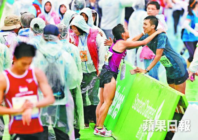 渣馬昨在滂沱大雨下曲終人散,天公不造美,賽事仍吸引61,000人參加,出席率達83%;其中長跑夫妻檔,參加全馬的姚潔貞獲丈夫陳家豪巧妙安排「一同」過終點,潔貞亦在壯年組封后,與徐志堅蟬聯本地全馬冠軍寶座。