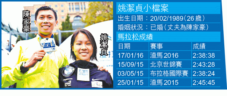 去年五月在布拉格國際馬拉松已取得今年里約熱內盧奧運參賽資格,兼造出2小時38分24秒個人最佳成績的潔貞,昨晨在惡劣天氣下,以2小時38分38秒完成賽事,衞冕本地組女子全馬冠軍。雖然距離陳敏儀的香港紀錄2小時35分49秒還差三分鐘,但第二次參加渣馬全馬賽的潔貞,對總排名得第六已感到滿意。