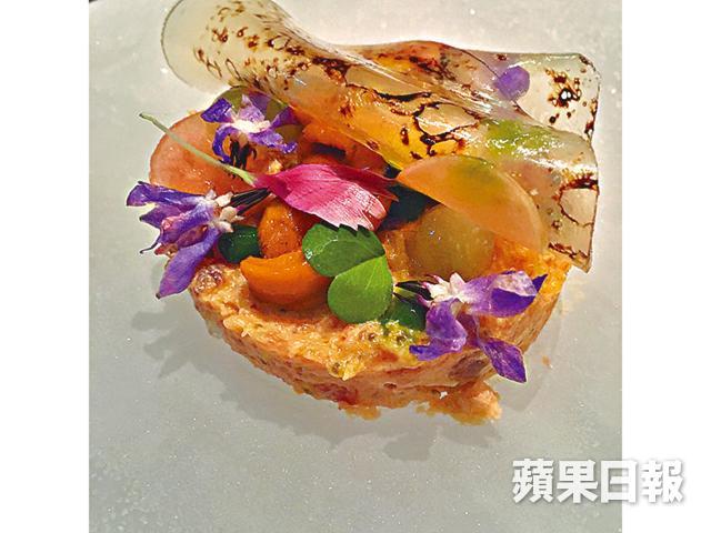在海鮮菜式中,最令筆者一試難忘的就是吞拿魚海膽他他。肥美的吞拿魚腩,配上日本海膽、脆米、小蘿蔔粒、彩色的花瓣,再蓋上一層薄薄的青瓜汁啫喱,賣相實在是無懈可擊,好像一幅畫一樣,而味道入口清甜,鮮味無盡。不能不提的就是大閘蟹「壽司」。我光顧的時候適逢大閘蟹當造,廚師很有心幾把大閘蟹拆肉當作飯,用紫蘇葉當作紫菜,之後再將大閘蟹膏放在大閘蟹的肉上造成一隻軍艦,賣相吸引。