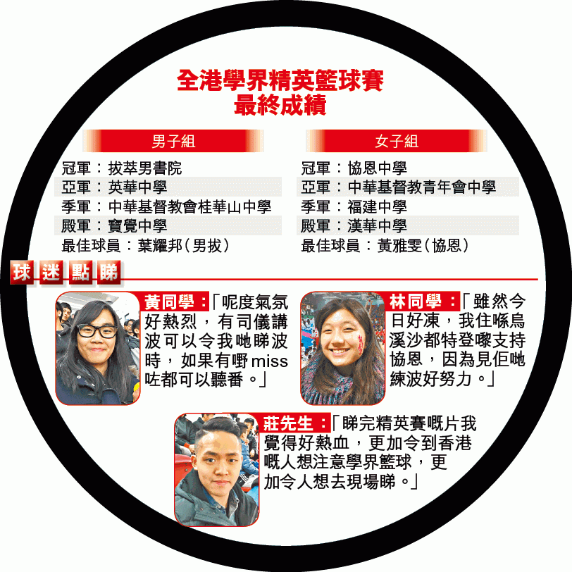 昨日寒流襲港,但在灣仔修頓室內場卻掀起一股熾熱的籃球火。在嚴寒下仍然無阻球迷排隊入場欣賞全港學界精英籃球賽的決賽,在全場球迷的見證下,由傳統學界體育勁旅拔萃男書院(男拔)及協恩中學攜手衞冕男、女子組學界精英賽。記者:盧曉君、徐嘉華