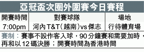 港超盟主傑志香港時間今晚七時,在河內的行待體育場舉行的亞冠盃第二圈外圍賽,誓要克服寒冷天氣、爛場作賽及比賽足球較細小等不利因素,希望能夠擊敗越南勁旅河內T&T,向進軍亞冠盃的夢想再踏前一步。