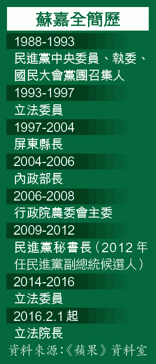 台灣新一屆立法院昨正式開會並進行改選,民進黨籍的蘇嘉全和蔡其昌分別當選院長、副院長,創下台灣立法院長正副議長均由民進黨出任的歷史。昨午蘇、蔡宣誓就職,告示立法院進入「綠治」時代;綠營佔多數的新國會頭炮,有可能報復藍營,逼教育部撤銷「微調課綱」。行政院「看守內閣」昨也宣誓就職。未來幾個月台灣政壇將進入藍綠膠着狀態。