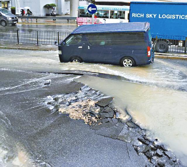 【本報訊】荃灣楊屋道一條直徑300毫米地底鹹水管,昨晨疑因水管老化突然爆裂,大量鹹水夾着沙泥湧出,導致路面下陷及水浸街。一輛客貨車駛經時前輪被卡着無法動彈,要消防員拯救,受影響路面封閉,工人搶修。