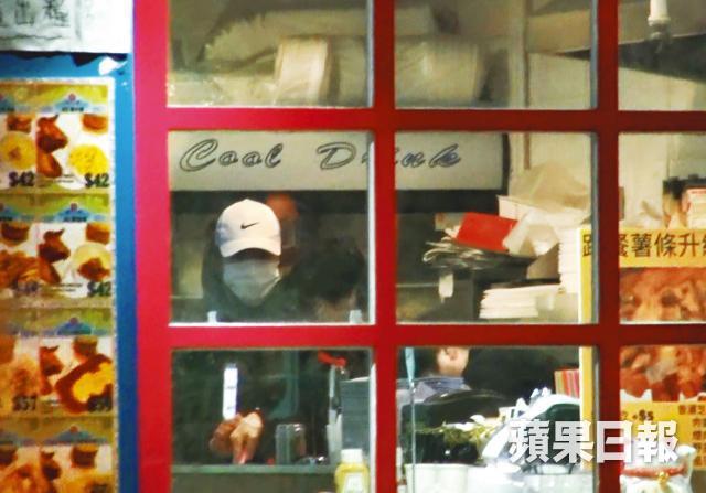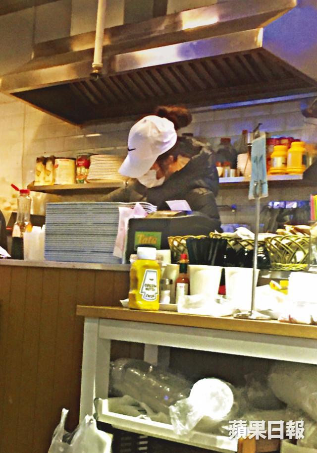 日前記者按報料去到位於元朗鳳攸南街嘅「Tata」快餐店,果然見到頭戴白色cap帽,着黑色羽絨同戴口罩嘅崔碧珈喺店入面幫手,可能嗰晚天氣寒冷,加上已經晚上10點幾,所以人流唔多,但崔碧珈都全程留喺開放式廚房入面幫手,好少行出嚟樓面,到客人走晒佢先明顯放下戒心,行出嚟同員工傾吓偈。