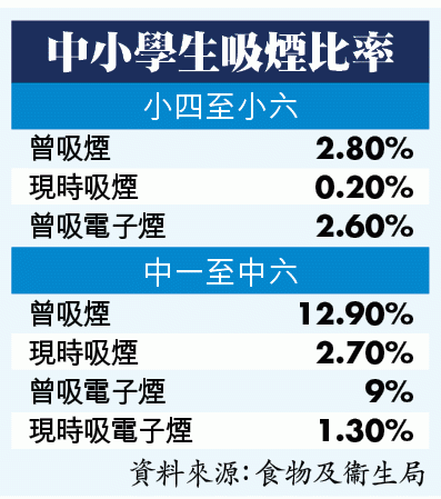 【本報訊】食物及衞生局公佈本港吸煙情況的統計數字,當中特別針對中小學生吸煙趨勢進行調查。當局委託港大於2014至2015年度成功訪問80間小學及92間中學,雖然中小學生吸煙比率輕微下跌,但吸食電子煙的比率令人關注,近一成中學生曾吸食電子煙,2.6%小四至小六學生亦曾嘗試吸食電子煙。