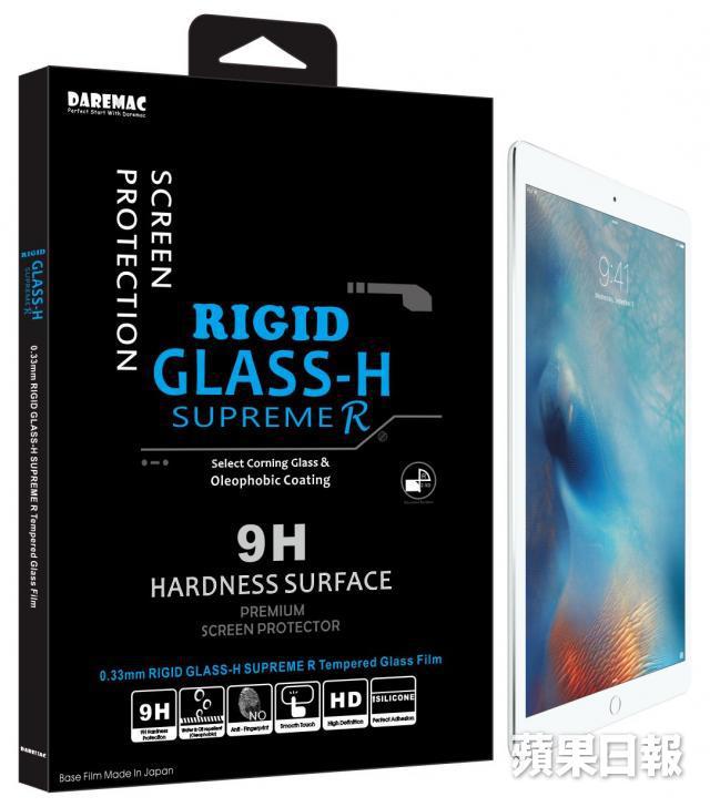 這個保護貼是由DAREMAC推出的RIGID GLASS-H SUPREME R CORNING GLASS iPad Pro 版本,其採用的是康寧玻璃製造,密度比一般玻璃貼較高,據稱堅硬而且防碎,除此之外亦在表面有疏水疏油塗層,減少指紋痕跡及耐用度更高,加上全包邊,不會有刮手情況出現,相信普通落地不會連屏幕一起受損吧!