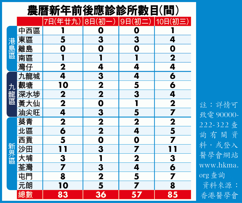 農曆新年快到,香港醫學會「醫訊通」免費熱線(見表)將於周日(7日)起一連4天農曆新年假期,提供應診診所資料。屆時全港共有105位私人執業醫生,11間私家醫院門診部及13間公立診所登記應診。