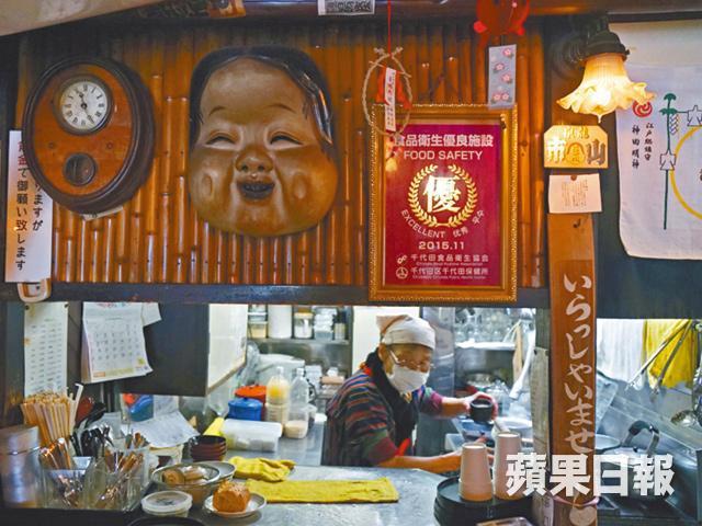 櫃枱上方的面具,是老店被燒毀時唯一被帶走的東西,如今就像神明一樣保祐小店。