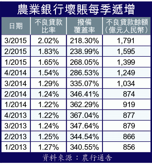 由2014年開始,內銀不良貸款餘額和比率出現緩步上升的趨勢,用「溫水煮蛙」去形容是相當切貼。以壞賬最多的農業銀行(1288)為例,2014年首季不良貸款率是1.22%,第二、三季上升不足0.1個百分點。到了去年,每季不良貸款比率增幅約0.1至0.2個百分點。兩年間就算不良貸款額倍增,但季與季之間,卻只輕微增長,令人感覺到「唔係好差啫」。