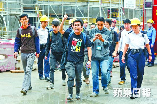 昨凌晨4時許,朱凱迪等7男1女進入高鐵地盤,約1小時後,他們爬上40米高吊臂懸掛兩條條幅,黃浩銘持「大聲公」抗議高鐵工程。警方接報到場戒備,同時勸喻他們離去,至早上約9時他們返回地面,共擾攘約5小時後離去。