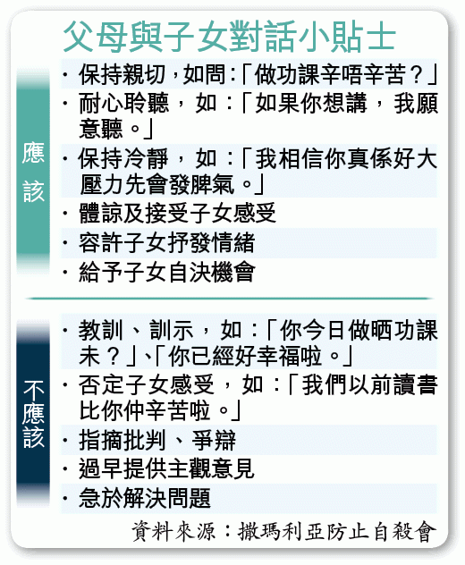新學年開學至今有多名學生自殺,令外界關注學生心理健康。撒瑪利亞防止自殺會昨於長沙灣九龍工業學校,舉行「擁抱孩子一分鐘」運動起動禮及預防學生自殺講座,鼓勵家長藉擁抱子女表達關懷。兒子自殺離世的母親阿嬌講述自身經歷,呼籲各位父母應把握機會多關心子女。