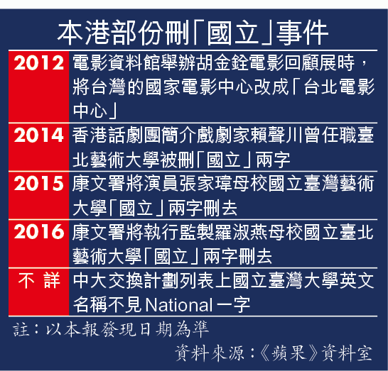 類似事件不一而足,畢業於國立臺南大學、去年11月在港參與音樂劇《布拉格·1968》執行舞台監督鄭暹珠亦在facebook披露遭康文署政治審查。她稱署方付印的場刊寫上自己畢業於臺南大學,「國立」兩字消失不見。而中大聯合書院網頁的交換計劃列表上,國立臺灣大學的名稱是「Taiwan University」,而不是正確校名「National Taiwan University」。