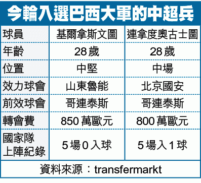 雖然拉美利斯、阿歷士泰斯拿及迪亞高泰迪利落選,但在今次國際賽期,巴西主帥鄧加都挑選了兩名實而不華的中超兵入伍,他們分別是山東魯能中堅基爾拿斯文圖及北京國安中場連拿度奧古士圖。