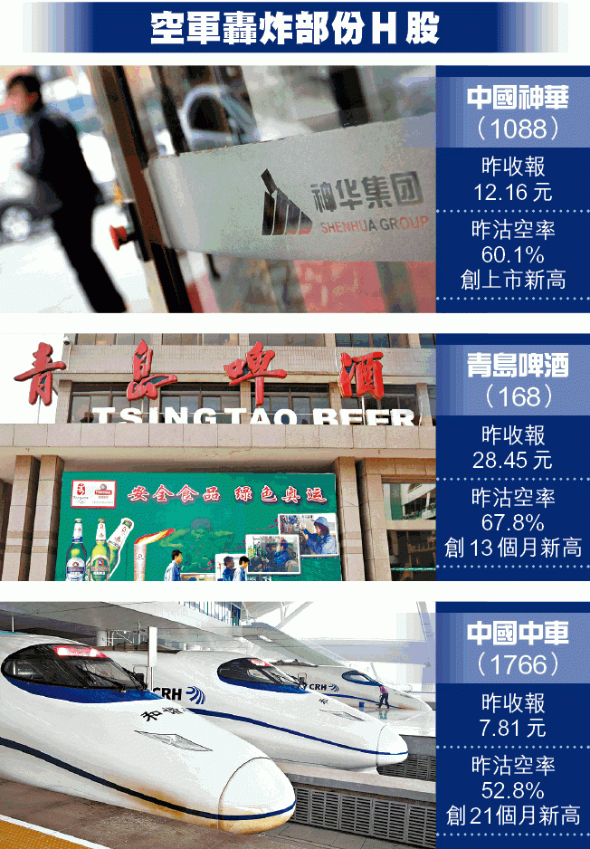 部份H股昨被「空軍」狙擊,神華昨沽空率飆近一倍至60.1%,創2005年6月上市以來新高,青島啤酒(168)沽空亦達67.8%的一年多高位,兩股昨雙雙跌逾2%。中國中車(1766)公佈重組後首份年度業績前夕,沽空亦升至近兩年高位。