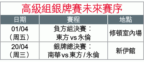 南華勝出後將晉身四月20日在新伊館舉行的總決賽,而東方就要在周五舉行的負方組決賽面對永倫,爭入最後總決賽一席位。
