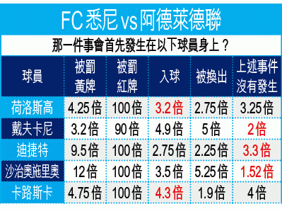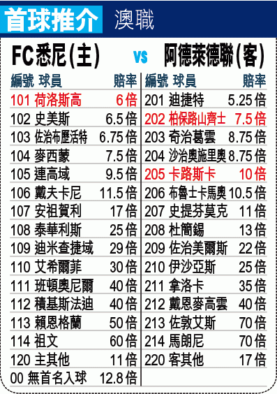 力爭成為今季澳職常規賽一哥的阿德萊德聯近況好之餘陣容又完整,故周六於尾二一輪常規賽作客到近來於常規賽表現差勁的FC悉尼,有力贏波而回,「讓球」平手值得捧場。(球賽編號:星期六7;有線64及203台今日4:30pm直播)