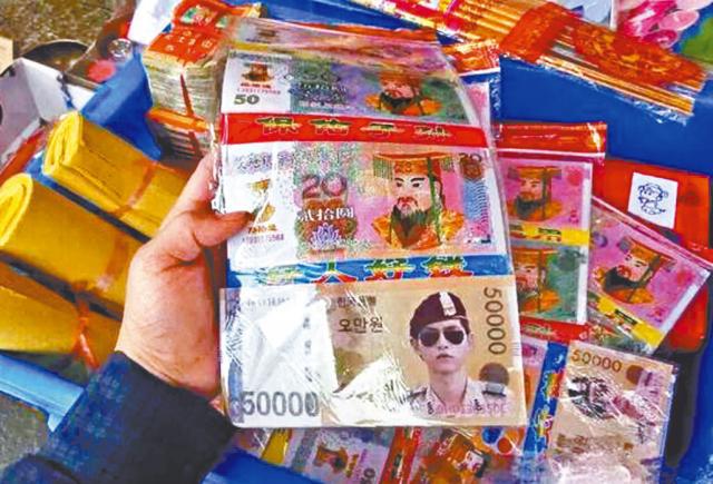 宋仲基憑韓劇《太陽的後裔》的Man爆軍人角色,看得女粉絲如癡如醉,不但被內地網民封為國民老公,影響力更遠至「地府」;昨微博有網民分享一套面值5萬韓圜(約337港元)的「特別版」冥鈔,印有宋仲基在《太陽的後裔》中穿迷彩服、戴太陽眼鏡的劇照。