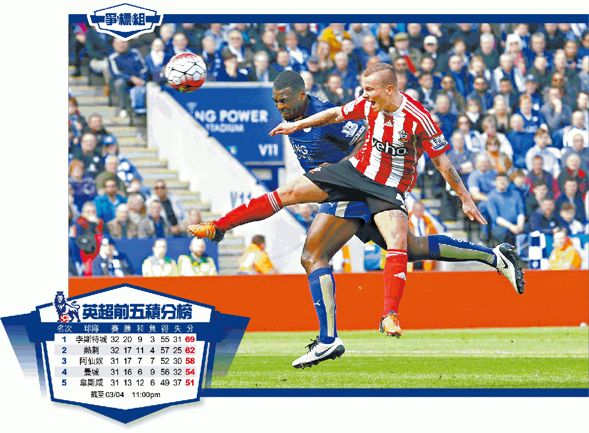 李斯特城周日於英超迎戰修咸頓,憑中堅韋斯摩根於上半場頂入全場唯一入球,最終小勝1:0,賽後以32戰得69分續居榜首,並趁熱刺上周六打和利物浦而失兩分,把領先優勢由原來的五分擴大至七分,離創歷史贏得首個英超冠軍又近了一步。