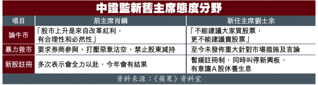 結果在今年3月,總理李克強政府工作報告刪除了去年報告原有的註冊制內容,有消息指是劉士余上任後向中央游說,以讓A股休養生息。除了暫緩註冊制外,之前同樣被指會同樣帶來大量新股抽血效應的戰略新興板,亦已被叫停,顯示劉士余的優先任務不是抽水,而是A股災後重建。