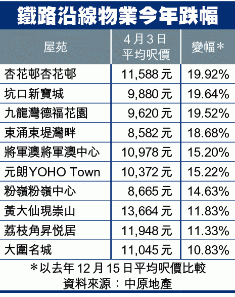 本報追蹤全港24個鄰近鐵路站的屋苑價格,比較目前與去年底平均呎價,除港島大學站寶翠園及青衣站盈翠半島逆市升之外,其他22個屋苑全部報跌,跌幅由3.5至19.9%,3個屋苑跌幅更近兩成,包括杏花邨、將軍澳新寶城、九龍灣德福花園,其中跌幅王是杏花邨,目前每呎均價11,588元,較去年12月中錄14,471元,跌19.9%。