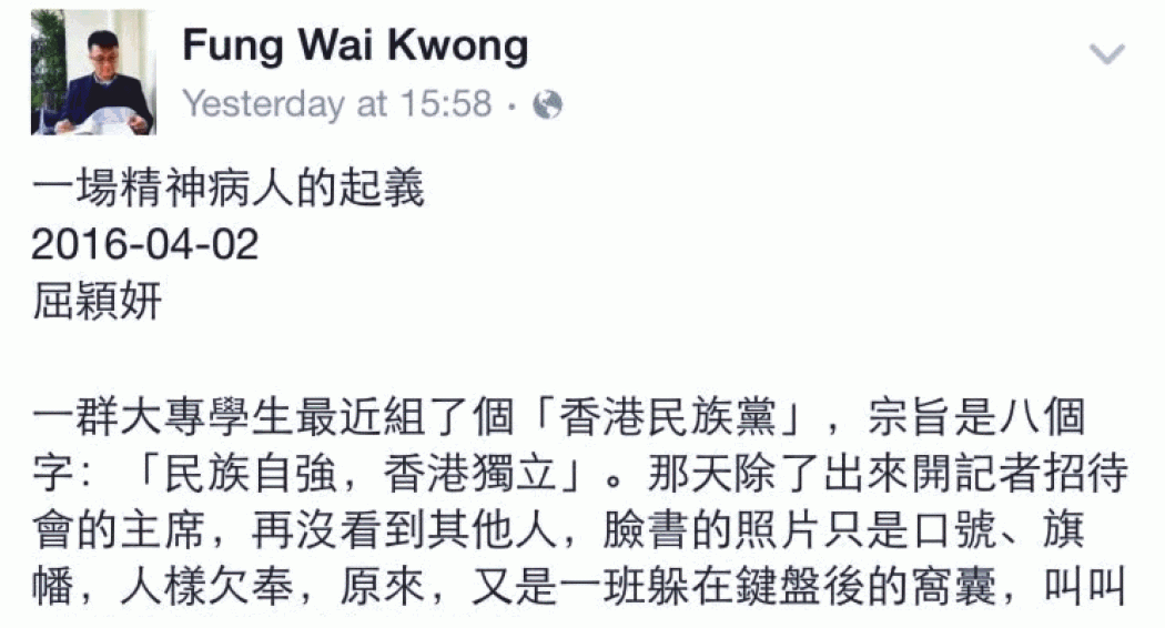 𢭃咁高人工可能因為佢玩facebook玩到出神入化,幾乎一出po就出事,好似近日佢喺fb分享咗屈穎妍一篇題為〈一場精神病人的起義〉嘅文章,內容大致暗將香港民族黨發起人同精神病扯上關係,又話「根據醫管局估算,香港平均每7人就有一人患有精神病,病人本身的妄語怪行,他們自己都不能自控」等。