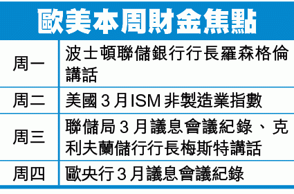 美國本周將有兩項事項或數據值得留意,包括聯儲局周三公佈3月議息會議紀錄,而上月ISM非製造業指數周二公佈。