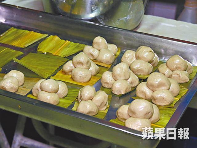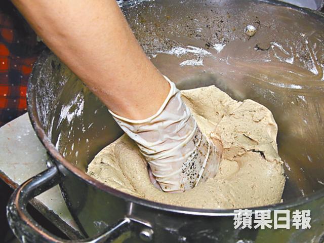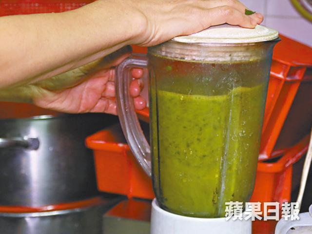 平日要吃到雞屎藤茶果,或需走入新界,甚至潛入深山,嚐到的也大多是婆婆級的傳統手藝,在市區並不常見。主要材料雞屎藤草是種常見於新界的攀藤植物,元朗及東涌山頭也可發現其身影。每星期,梅姐都會專程到元朗親自採摘雞屎藤草,「做雞屎藤,最麻煩係要到山頭摘草,好多人唔識分,其實唔知幾易!我一望就知啦,你睇塊葉長長哋尖尖呢就係喇!」梅姐邊說邊摘。說來慚愧,記者根本分不出它與一般樹葉有何分別,湊近細聞也只有陣陣草青味。回到舖頭,梅姐把葉逐片摘出,然後放入攪拌機攪碎,草汁青綠,氣味更濃,那是種難以用筆墨來形容的怪味,「客家人鍾意用嚟沖水飲,我哋相信雞屎藤有祛風活血、止痛解毒嘅功效。以前冇攪拌機,要用石舂慢慢鑿,不斷加水磨汁,𠵱家已經方便得多。」
