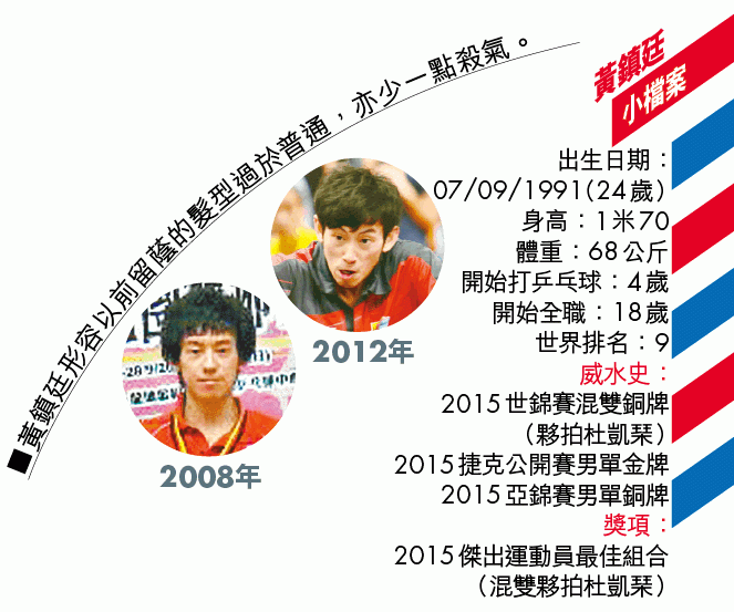 這All Back髮型,果真為鎮廷帶來好運──2014年開始在排名賽奪牌,包括夥拍大師兄唐鵬三奪男雙金牌,單打亦漸嘗四強滋味,年終排名55位;去年更是走勢凌厲,先奪三月西班牙單打銀牌、八月捷克公開賽再奪單打金牌,都是個人第一次。鎮廷四月最新世界排名是新高的第九位,大有機會藉此晉身八月里約奧運之餘,亦創下近廿多年來最高的香港男單排名;對上一位是8、90年代名將盧傳淞,世界排名曾升至最高第七位。