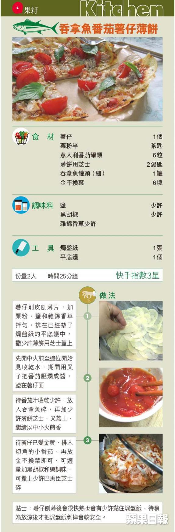 近期迷上烤焗菜,什麼東西都塞進焗爐去烤焗便會神奇地變得美味。但用焗爐烹調的時間較長,真的太餓時,還是開火用鑊煎最快手,而且一樣可以做到類近烤焗效果的小吃。這個以薯仔薄做的薄餅底,煎好後香脆得很,餡料更可以隨時變化組合。煎好後把焗盤紙的邊修好,吃的時候直接連底紙一起剪出,非常乾手淨腳。記者、食譜設計及攝影:謝翠玲