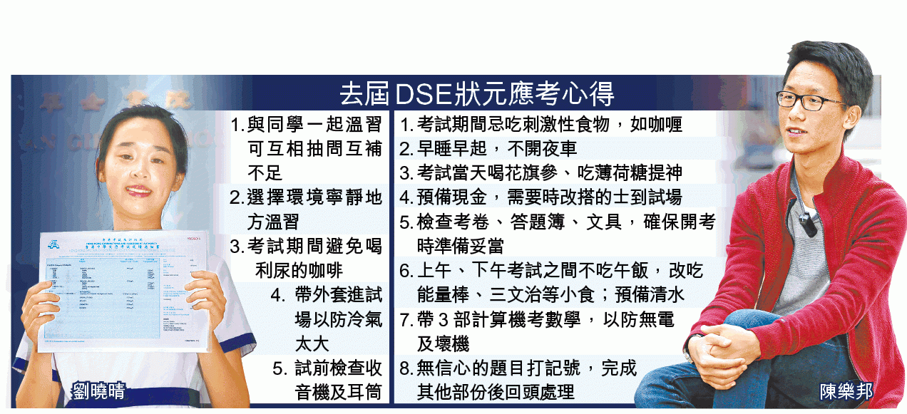 【本報訊】中學文憑試(DSE)主科明天開考,去年DSE兩名狀元陳樂邦及劉曉晴已入讀醫學院。兩位醫科生以過來人身份,建議臨近考試考生不要過份操練,「最緊要唔好咁chur」。陳樂邦會在試前一周調節作息,早睡早起,並避免吃刺激性食物如咖喱,以防臨時出現不適。