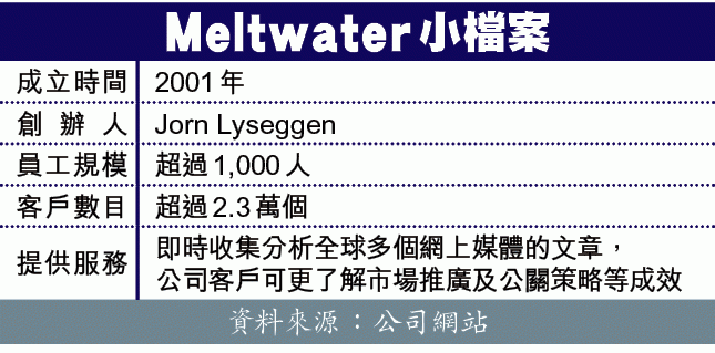 在2001年在挪威成立的Meltwater,提出網上整理及分析軟件,專門搜索不同網上媒體及社交媒體的報道,五年後在香港成立辦公室。John Box表示,不同品牌的市場推廣部門可以借助其軟件,了解網絡世界對其產品或品牌的關注度及評價,「例如百事可樂推出一項廣告活動後,會否令更多人提起這個品牌,以及與對手可口可樂作比較,分析這次推廣到底有沒有效。」