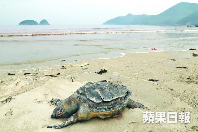 《蘋果》記者接獲消息即駕車到西灣亭,再沿大浪灣遠足徑步行了約2.5小時,至下午2時45分左右到達鹹田灣,見海灘正受紅潮侵襲,海面浮起一大片啡紅色藻類,部份墨魚及海魚疑缺氧死亡漂上沙灘,沙灘上亦有大量棄置的膠樽、發泡膠盒、浮標及零食錫紙袋等垃圾。記者走近海龜卧屍位置時,已見數名漁護署人員在場用黑膠袋包好龜屍撿走,稍後化驗以確定死因。