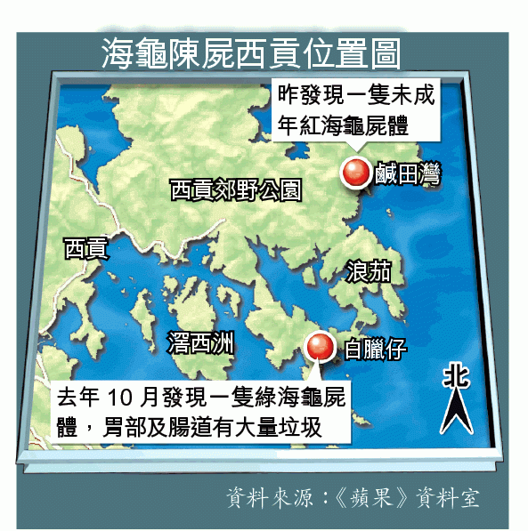 海龜食海洋垃圾死亡已非首次,一隻綠海龜去年10月被發現浮屍西貢白臘仔沙灘,由於被野狗撕咬拖行,發現其撕碎的胃部及腸道內充斥尼龍繩、膠條及包裝袋等大量海洋垃圾,世界自然基金會對此表示痛心,認為海洋垃圾正嚴重侵害海洋生態系統。