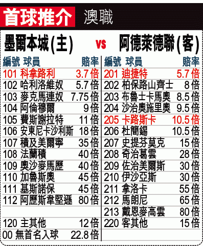 今季澳職常規賽進入最後一輪,周五碰頭的墨爾本城及阿德萊德聯都有機會爭做一哥,故定必傾力爭勝。考慮到阿聯近況好兼人腳完整,近年訪墨城往績又好,故有力取分而回,受讓平/半必博下盤,兼吼客W。(球賽編號:星期五1;有線64及203台今日5:40pm直播)